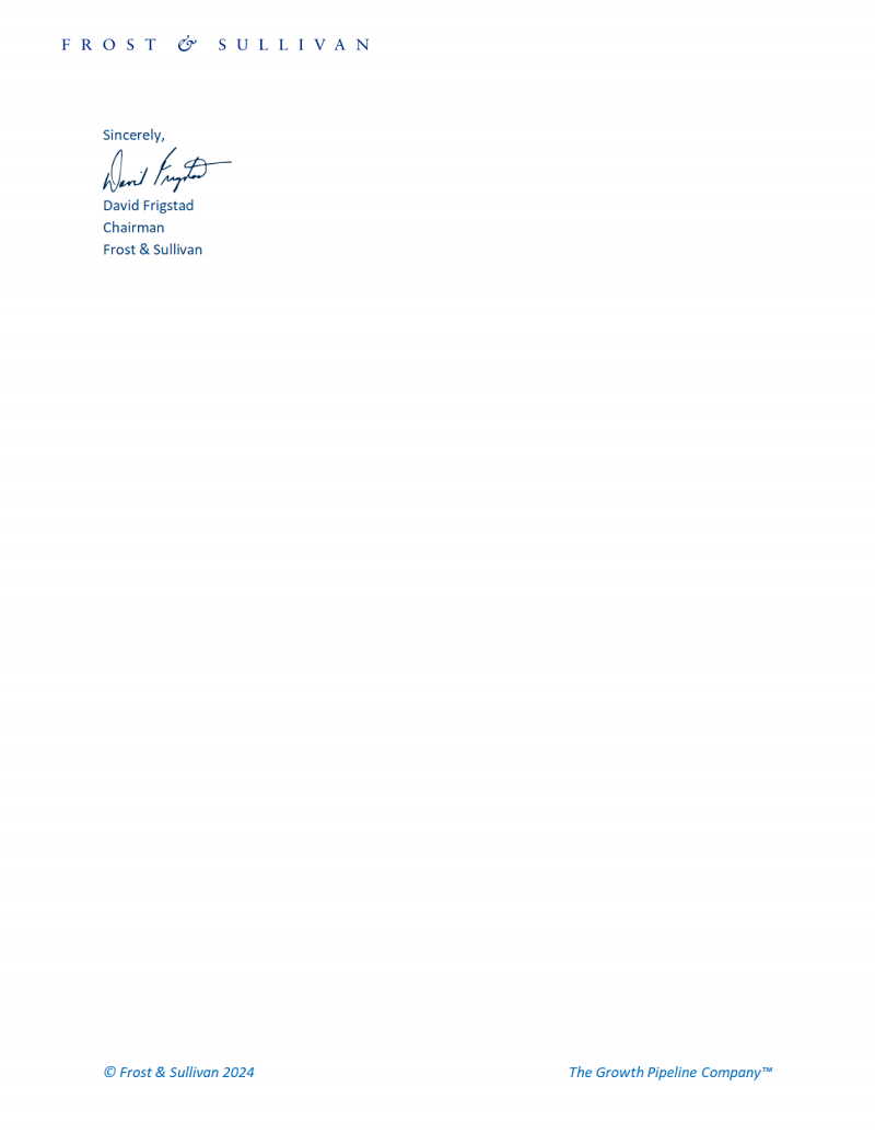 Frost & Sullivan主席通知開山獲獎(jiǎng)的祝賀信