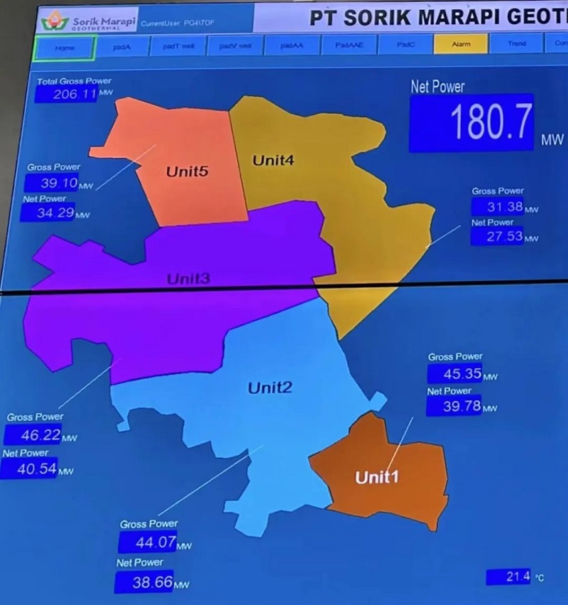 這是重要的里程碑事件,標(biāo)志著SMGP地?zé)犭娬具M(jìn)入到"200兆瓦俱樂部”。在全球地?zé)峤纾l(fā)電功率超過200兆瓦的電站(定義為發(fā)電設(shè)備生產(chǎn)的電力,外售電量還需要扣除電站運行自耗功)寥寥無幾,SMGP地?zé)犭娬具@座采用開山擁有完全自主知識產(chǎn)權(quán)的模塊電站,勢將成為全球地?zé)峤绲摹懊餍恰?,也是蘇門答臘最主要的地?zé)犭娬尽?/span>