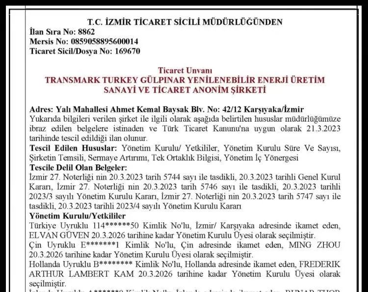 近日,開山集團(tuán)股份有限公司的全資公司OME (Eurasia) Pte., Ltd.(以下簡稱“OME Eurasia”)與Sonsuz Enerji Holing B.V.(以下簡稱“Sonsuz”)已在伊茲密爾完成Transmark turkey Gulpinar Yenilenebilir Enerji Urtetim Sanayi(以下簡稱“TTG”)公司的股權(quán)變更手續(xù),完成了OME Eurasia與Sonsuz此前簽署的《TTG公司股權(quán)認(rèn)購暨股東協(xié)議》所規(guī)定的交割程序。TTG新股東結(jié)構(gòu)及董事會成員已在土耳其工商機構(gòu)進(jìn)行登報。至此OME Eurasia已成為擁有TTG49%股份的股東,Sonsuz控股51%。