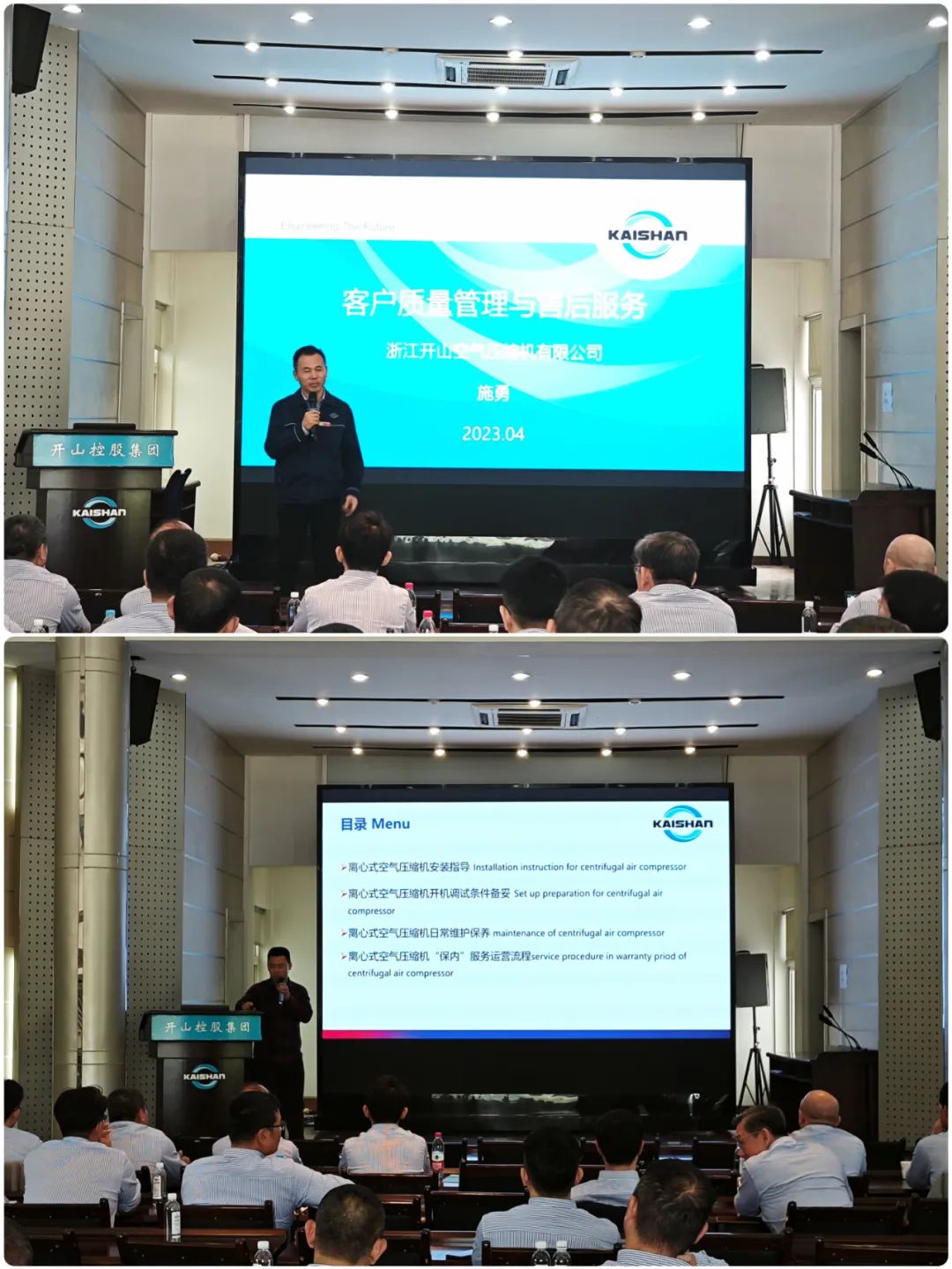 浙江開山壓縮機(jī)有限公司質(zhì)量總監(jiān)施勇做了開山傳統(tǒng)螺桿產(chǎn)品海外市場的支持流程和質(zhì)量提升流程匯報(bào),開山服務(wù)(上海)有限公司總經(jīng)理?xiàng)钷H做了離心機(jī)、PET等產(chǎn)品海外市場服務(wù)管理及服務(wù)培訓(xùn)。